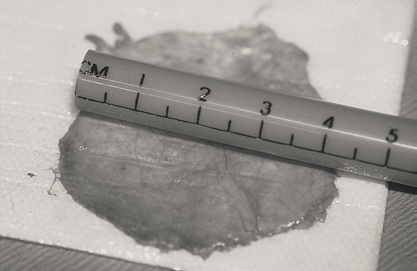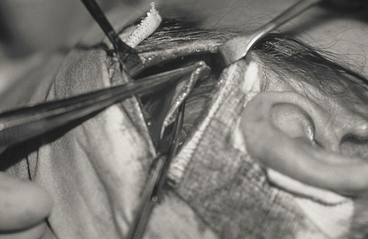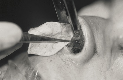 2. 選定模版: 在修補過程中,除了雙側鼻中隔黏膜外,會希望中間放置額外組織支撐並作為黏膜生長的模版。可選材料包含:骨膜(mastoid periosteum)、筋膜(temporalis fascia)、心包膜(pericranium)、鼻中隔軟骨/硬骨、 fascia lata、大腿外側筋膜,以及人工真皮(alloderm)。