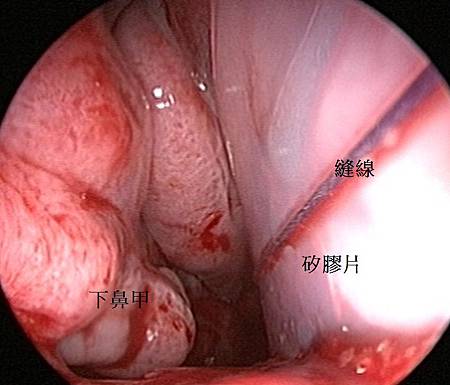 5. 保護與固定: 縫合後需在鼻中隔兩側縫上兩片矽膠片(Silicon sheet),約 7–10 天後拆除。