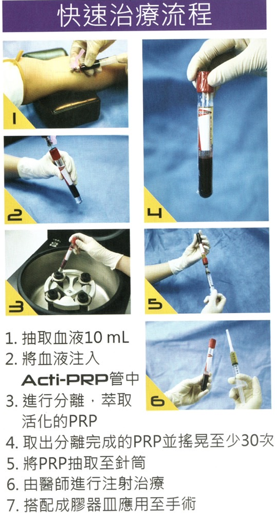 PRP可作為支架修復較大組織缺損部位,協助新細胞貼附及血管新生,PRP注射可加速傷口修復及降低感染風險。