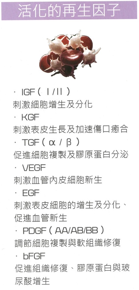 藉由抽取自體少量血液,經萃取得到高濃度血小板血漿,血小板不僅有止血的功能,同時富含大量的生長因子。生長因子具有刺激細胞增生的活性,為組織與器官修復的重要元素。天然純自體的高濃度血小板血漿,可避免排斥或過敏等不良現象,高規格萃取技術保留並激活最豐富完整的修復蛋白。